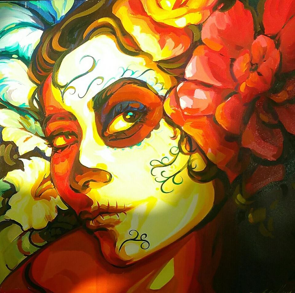 [Image: Gorgeous, colorful painting of a person with calavera face paint and flowers in their hair, gazing thoughtfully upward.]